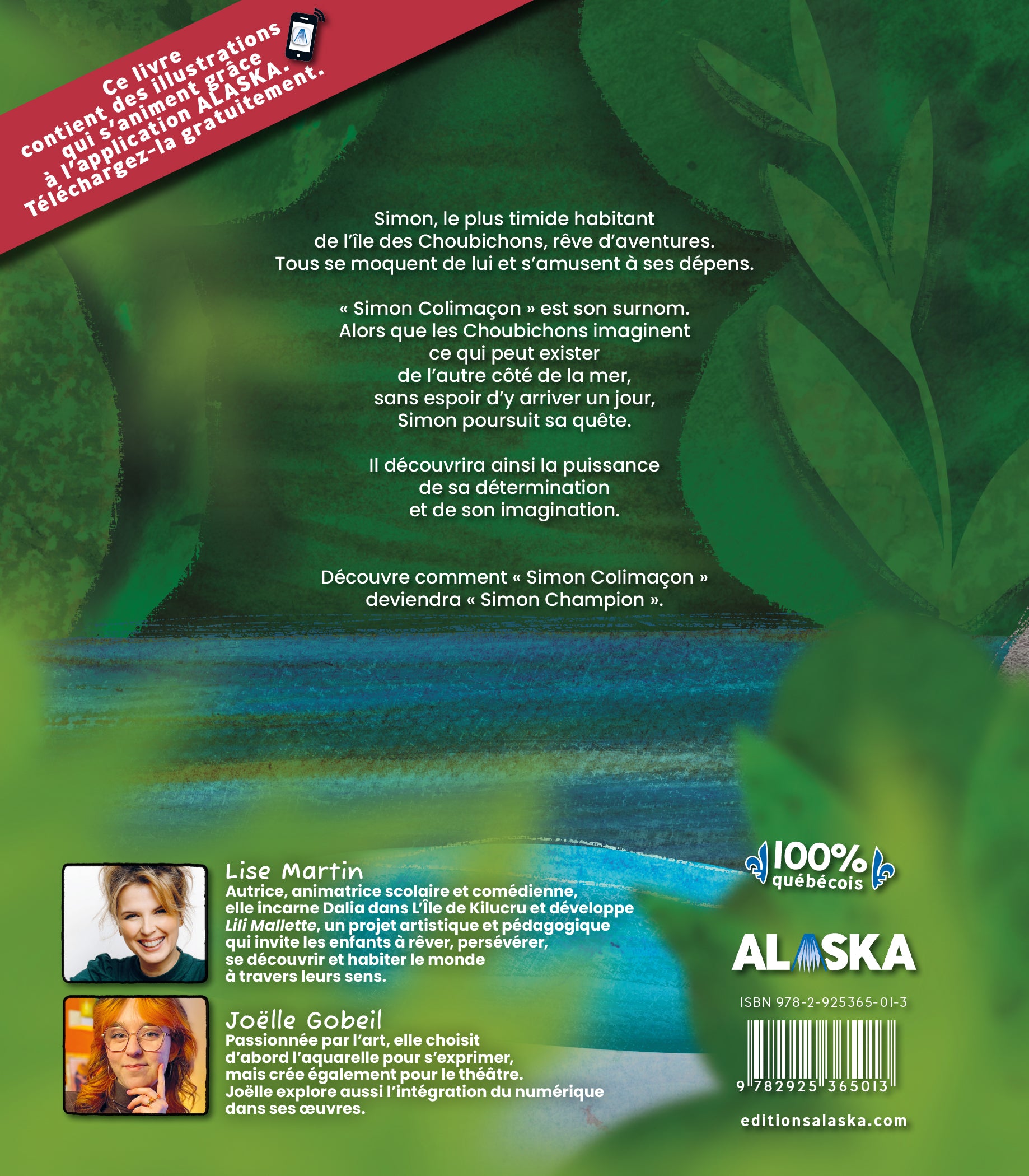 Simon, le plus timide habitant de l’île des Choubichons, rêve d’aventures. Tous se moquent de lui et s’amusent à ses dépens. « Simon Colimaçon » est son surnom. Alors que les Choubichons imaginent ce qui peut exister de l’autre côté de la mer, sans espoir d’y arriver un jour, Simon poursuit sa quête. Il découvrira ainsi la puissance de sa détermination et de son imagination. Découvre comment « Simon Colimaçon » deviendra « Simon Champion ».