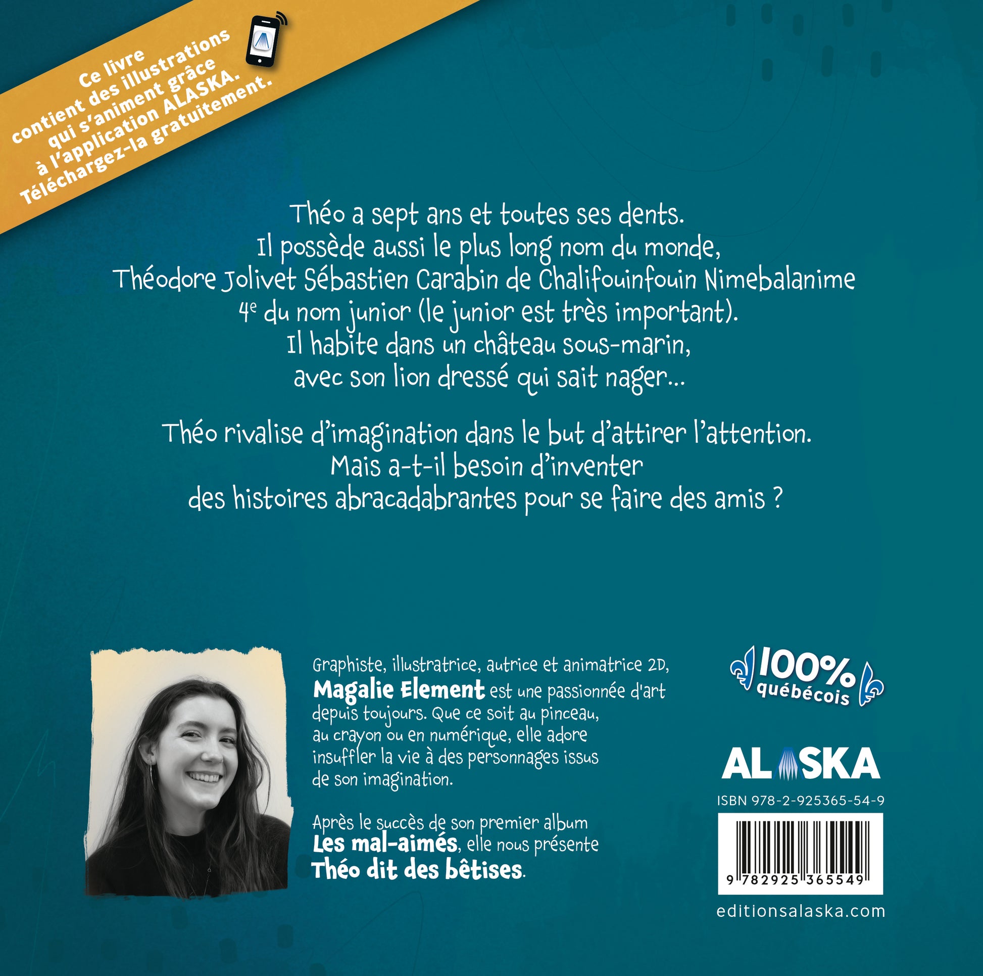 Graphiste et illustratrice, Magalie Element est une passionnée d’art depuis toujours. En plus de travailler comme artiste de scénarimage, elle vient de terminer ses études universitaires en animation. Que ce soit au pinceau, au crayon ou en numérique, elle aime rendre vie aux personnages tirés de son imagination. Après le succès de son premier album Les Mal-Aimés, elle nous présente Théo dit des bêtises.